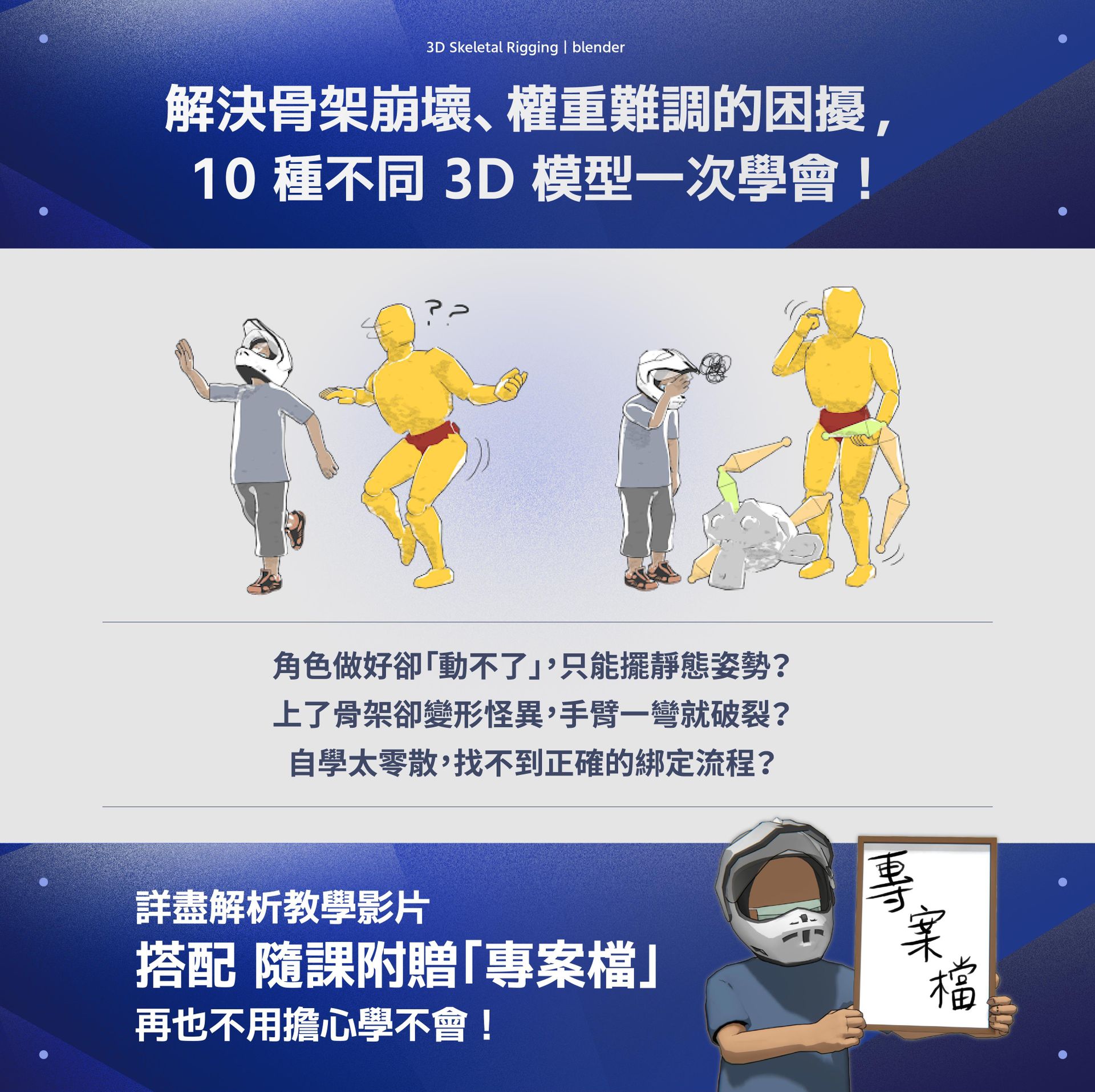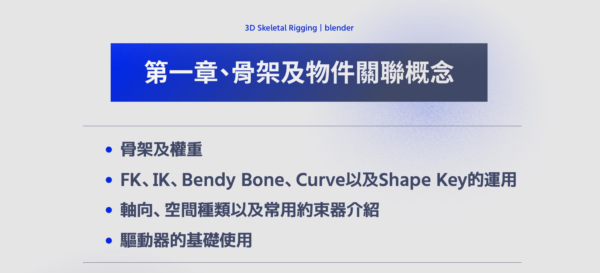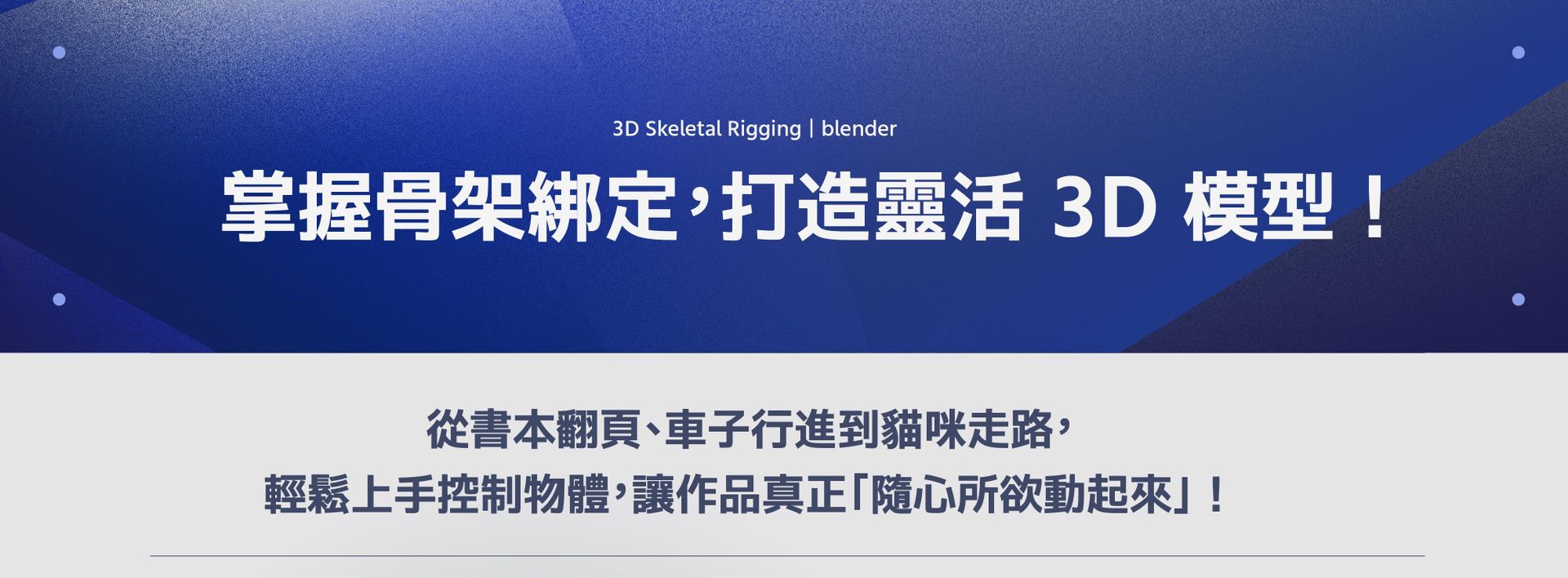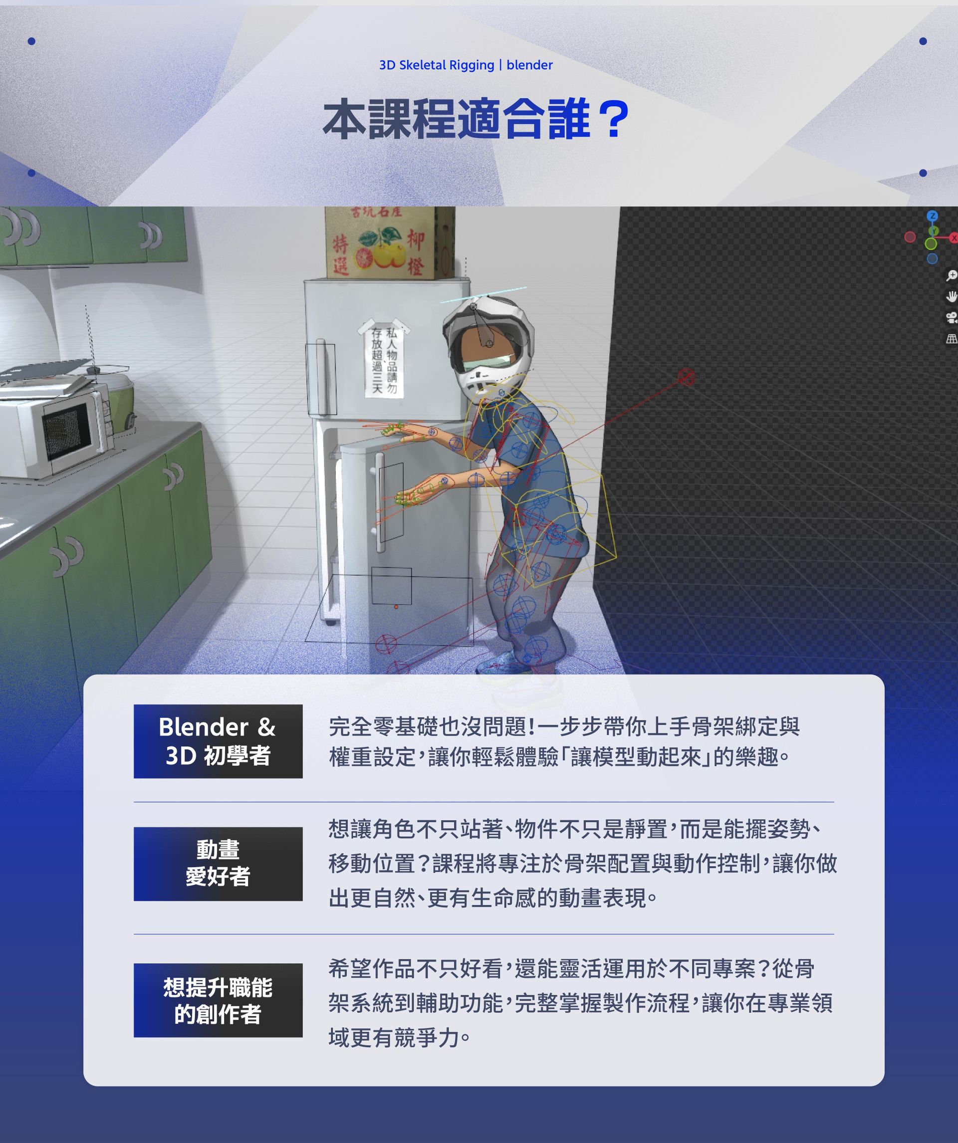 想讓你的 3D 角色動起來?這堂 Blender 骨架系統教學課程,將以「手把手帶領」的方式,陪你從零開始建立角色與場景的骨架結構,讓作品真正擁有生命力!課程內容涵蓋骨架架設、Shape Key、約束器(Constraint)與驅動器(Driver)等關鍵技術,教你如何靈活運用這些工具,快速打造可動 3D 模型,讓作品真正動起來。簡單直覺操作、邏輯式學習、彈性練習,讓原本看似複雜的骨架製作變得輕鬆易懂。無論你是動畫設計新手,還是想強化 3D 技術的創作者,這堂課都將是你踏入 Blender 進階領域的最佳起點!
