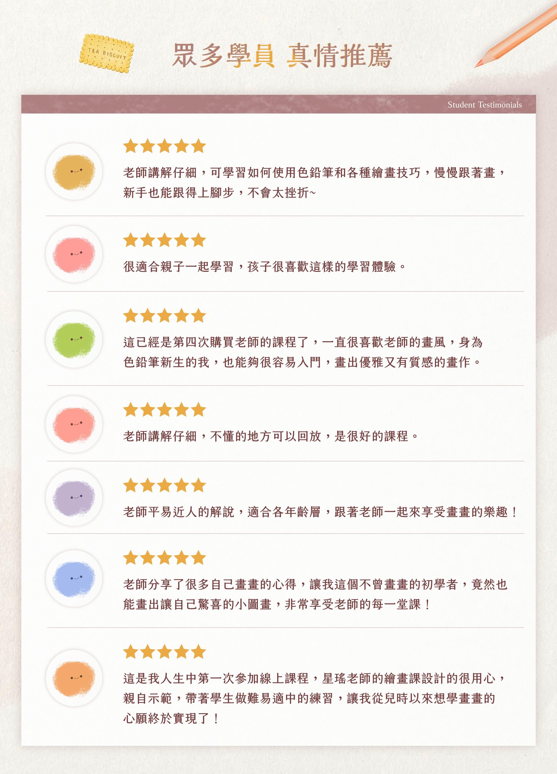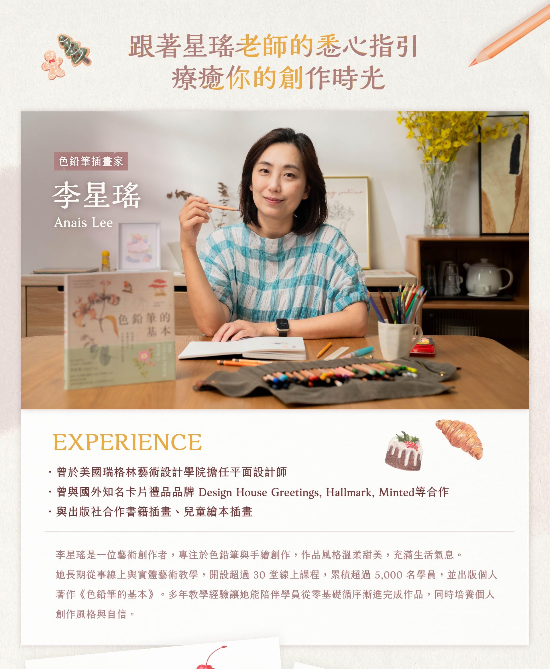 她曾與多個台灣知名學習平台、學校合作,開設色鉛筆繪畫課程,包括台北科技大學、火種計劃、PressPlay、YOTTA、知識衛星等,具備10年以上教學經驗,累積學員人數超過5000人。