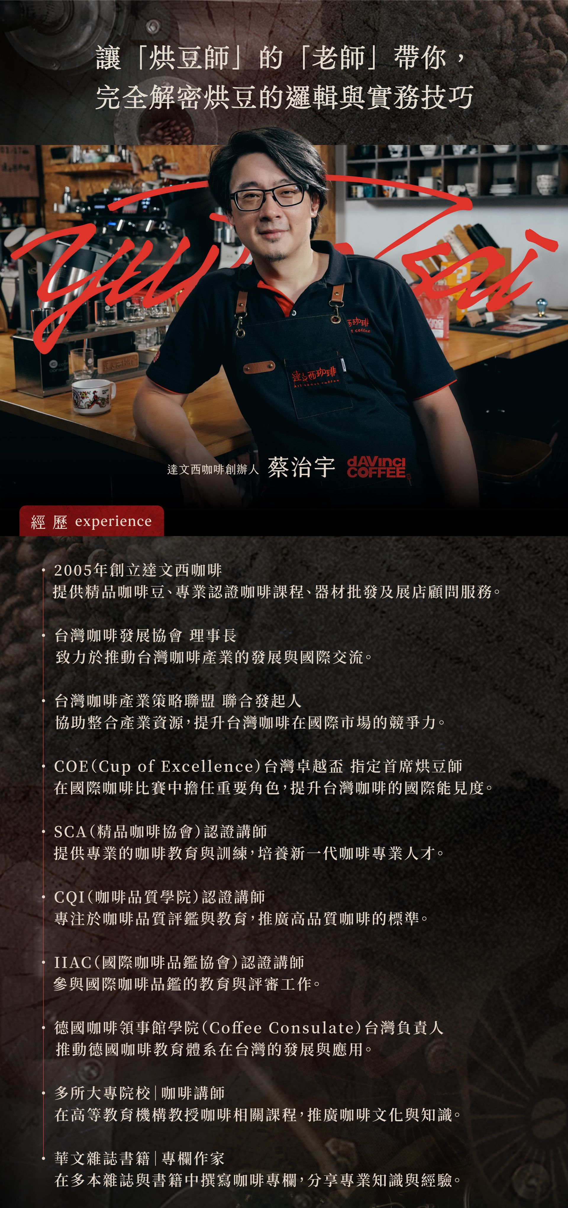 達文西咖啡創辦人|SCA / CQI / CC / IIAC 認證講師|蔡治宇達文西咖啡的烘豆學|掌控自己的咖啡風味