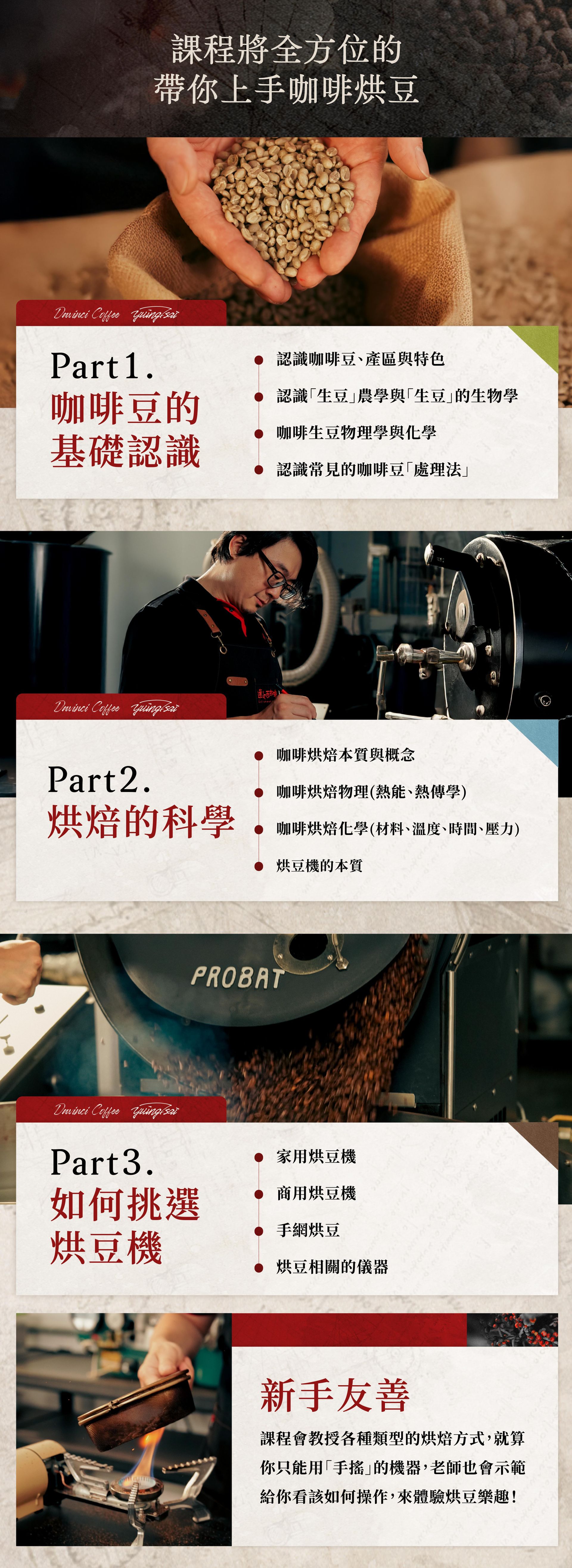 這堂咖啡烘豆學線上課,由達文西咖啡創辦人 蔡治宇,從產區、生豆、處理法、烘焙科學、挑選烘豆機、一路到不同烘焙風格、進行樣品烘焙、杯測,進而建立個性化烘焙、分析咖啡沖煮。這堂有理論、有實戰、深入淺出的烘豆課程,帶你透過扎實訓練,用數據凌駕感官判斷,持續產出穩定、高品質的精品咖啡,讓你在家也能輕鬆烘出好咖啡,掌控咖啡烘焙邏輯。