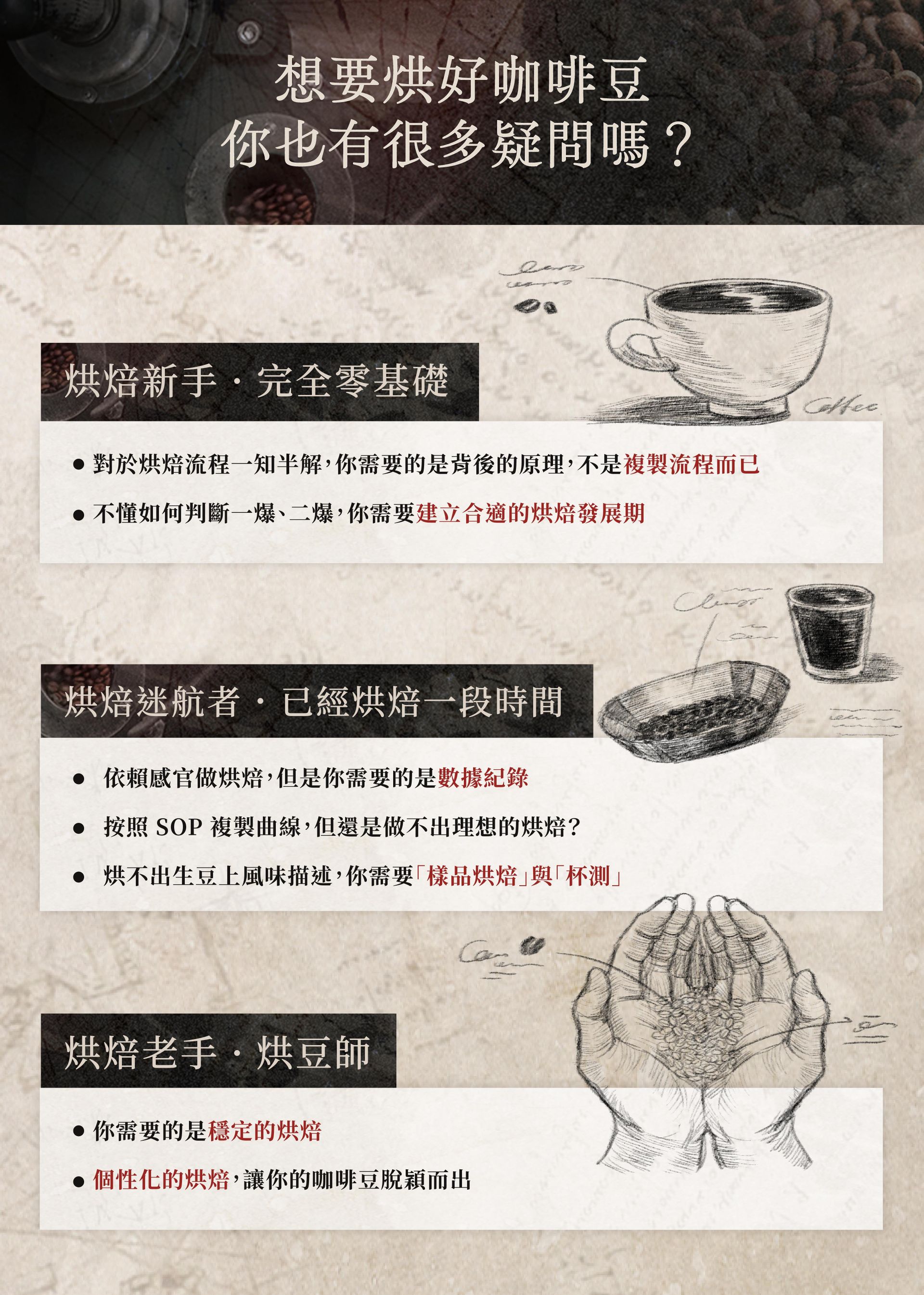 ➋掌握咖啡烘焙過程中發生的物理與化學變化,深入理解烘焙原理與邏輯。