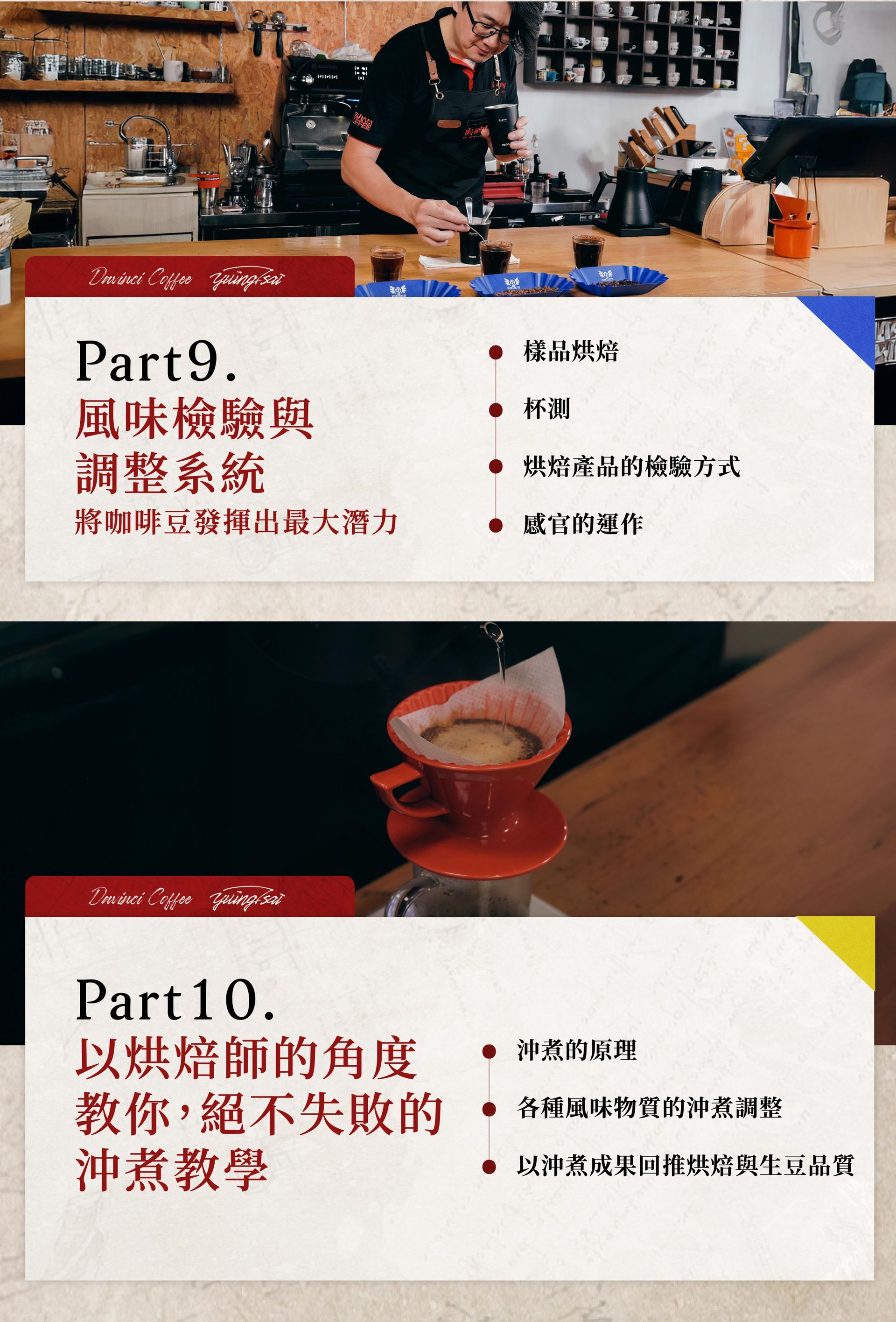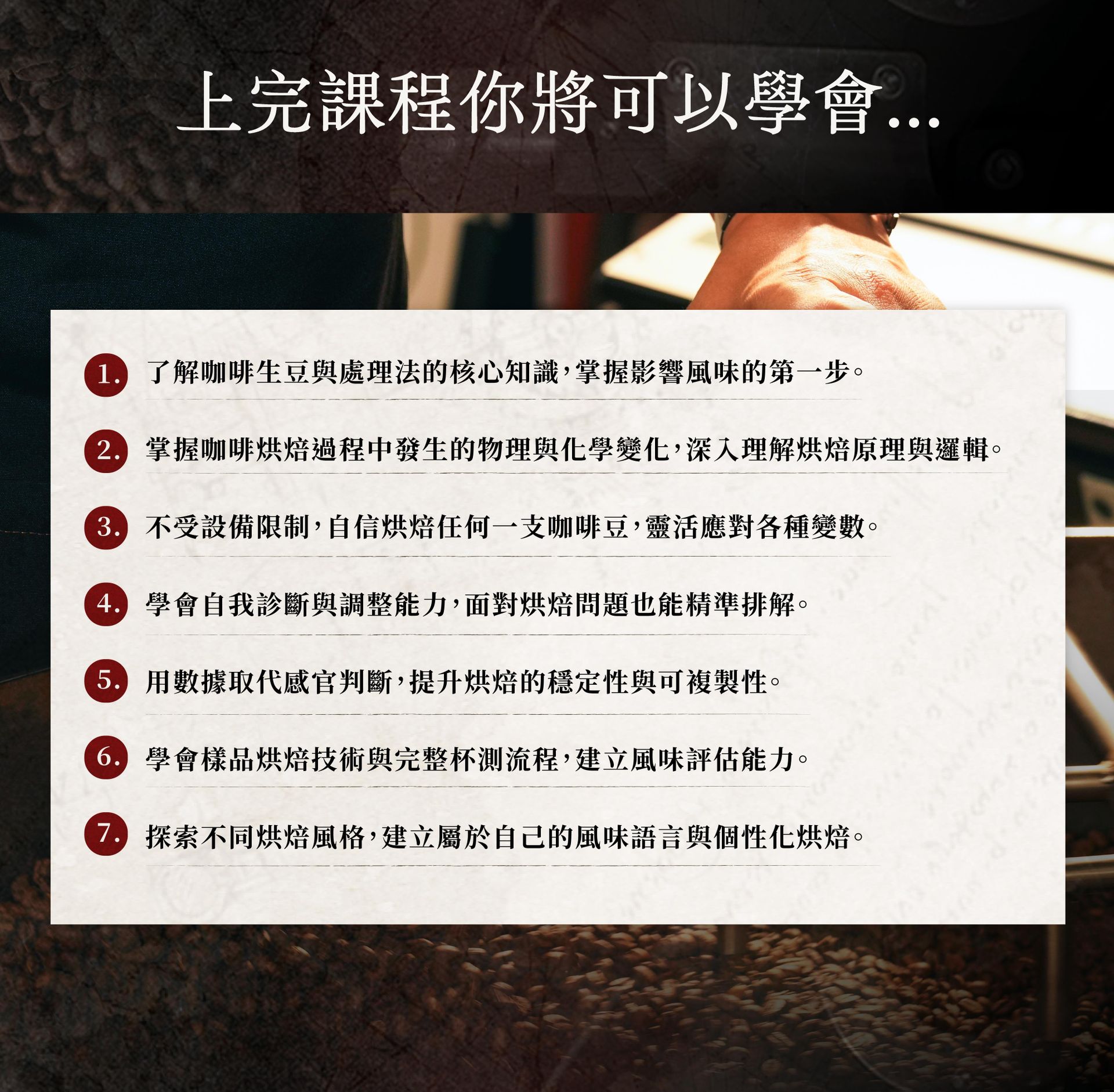 ➏學會樣品烘焙技術與完整杯測流程,建立風味評估能力。