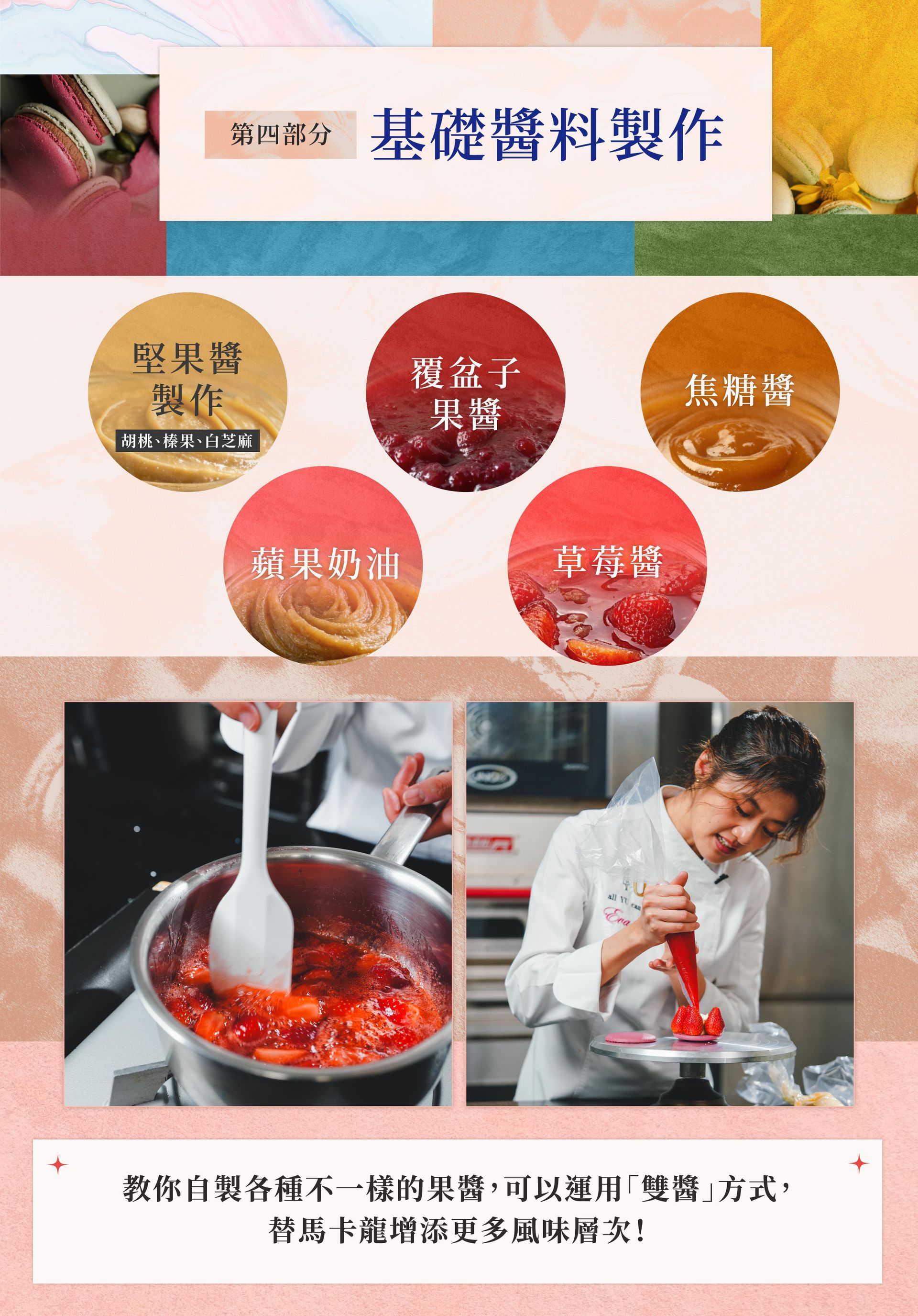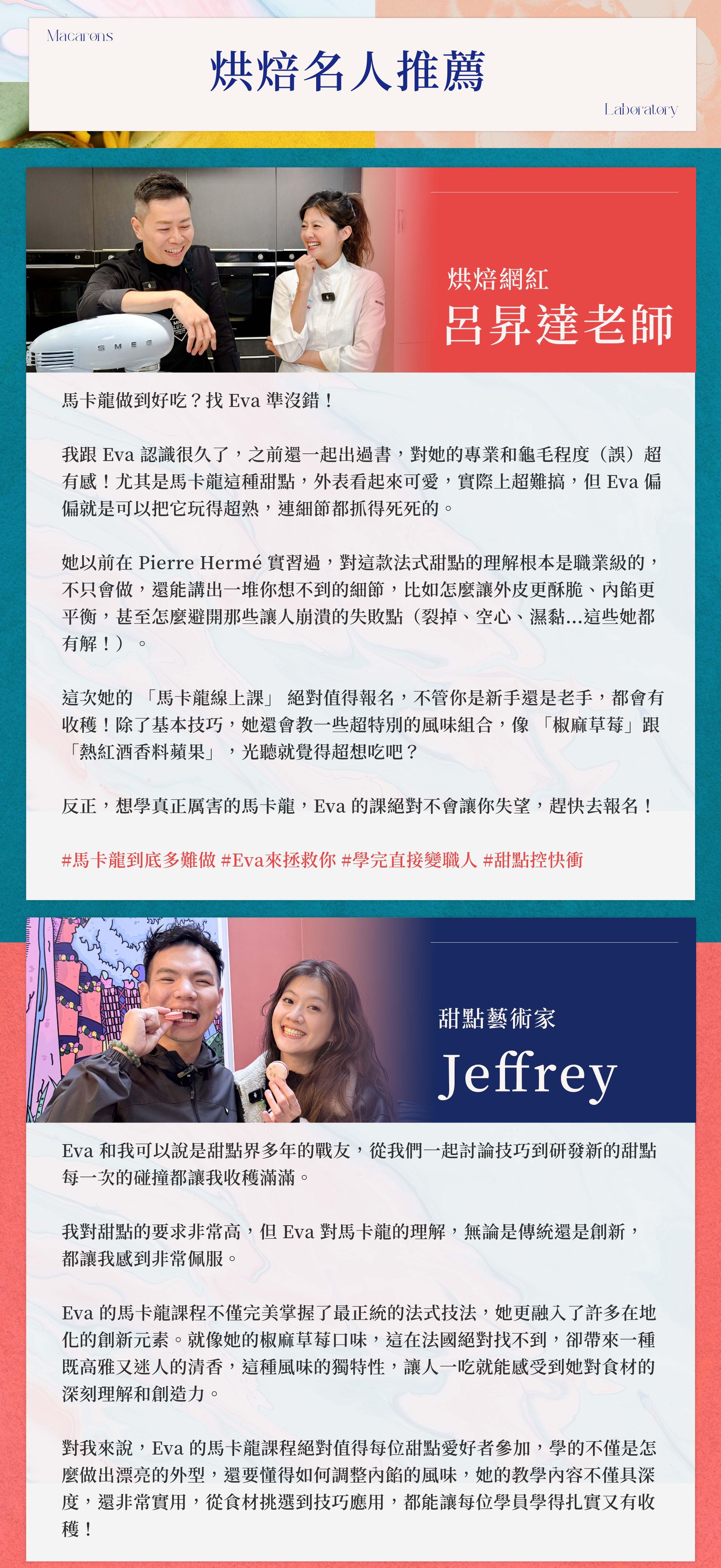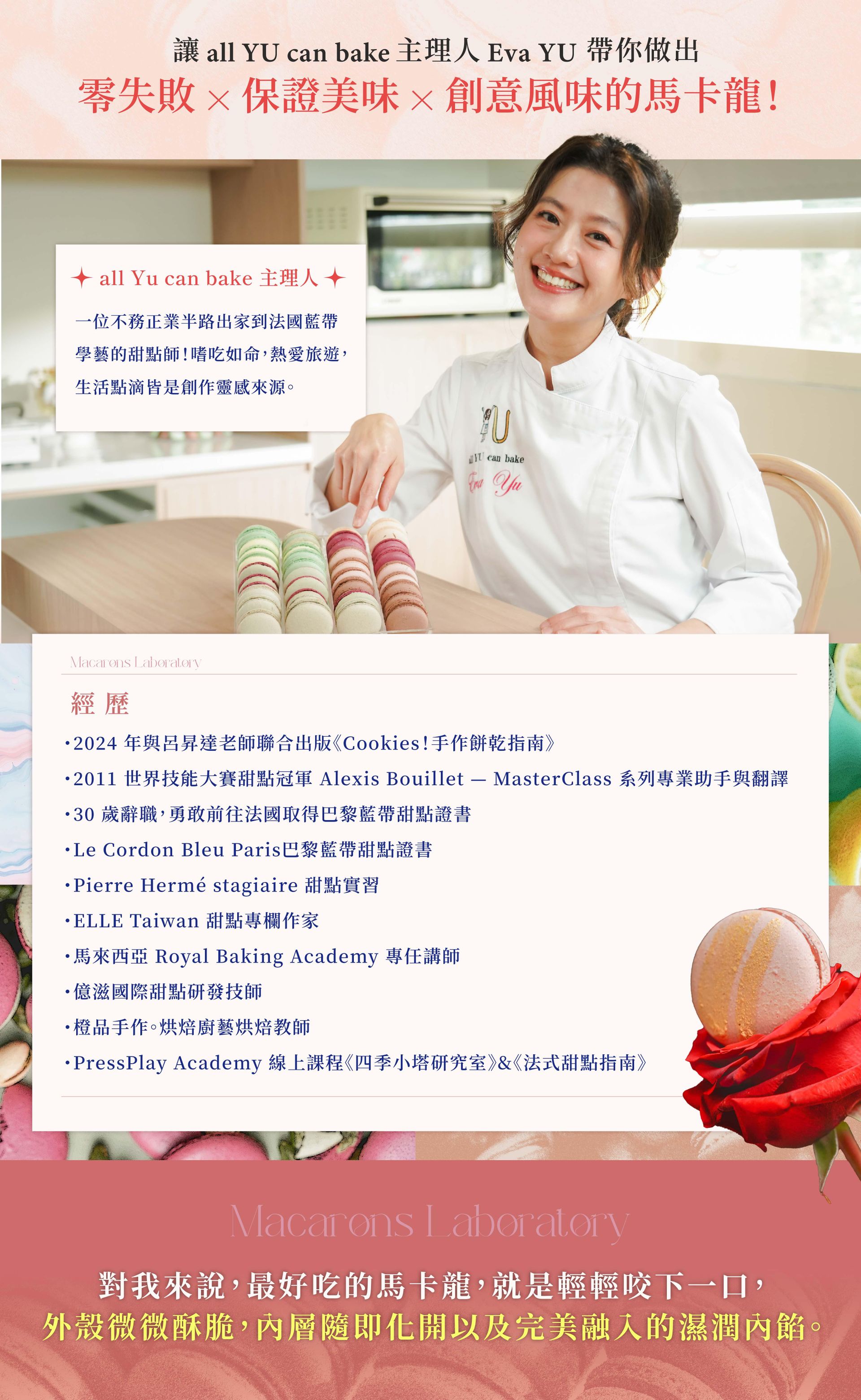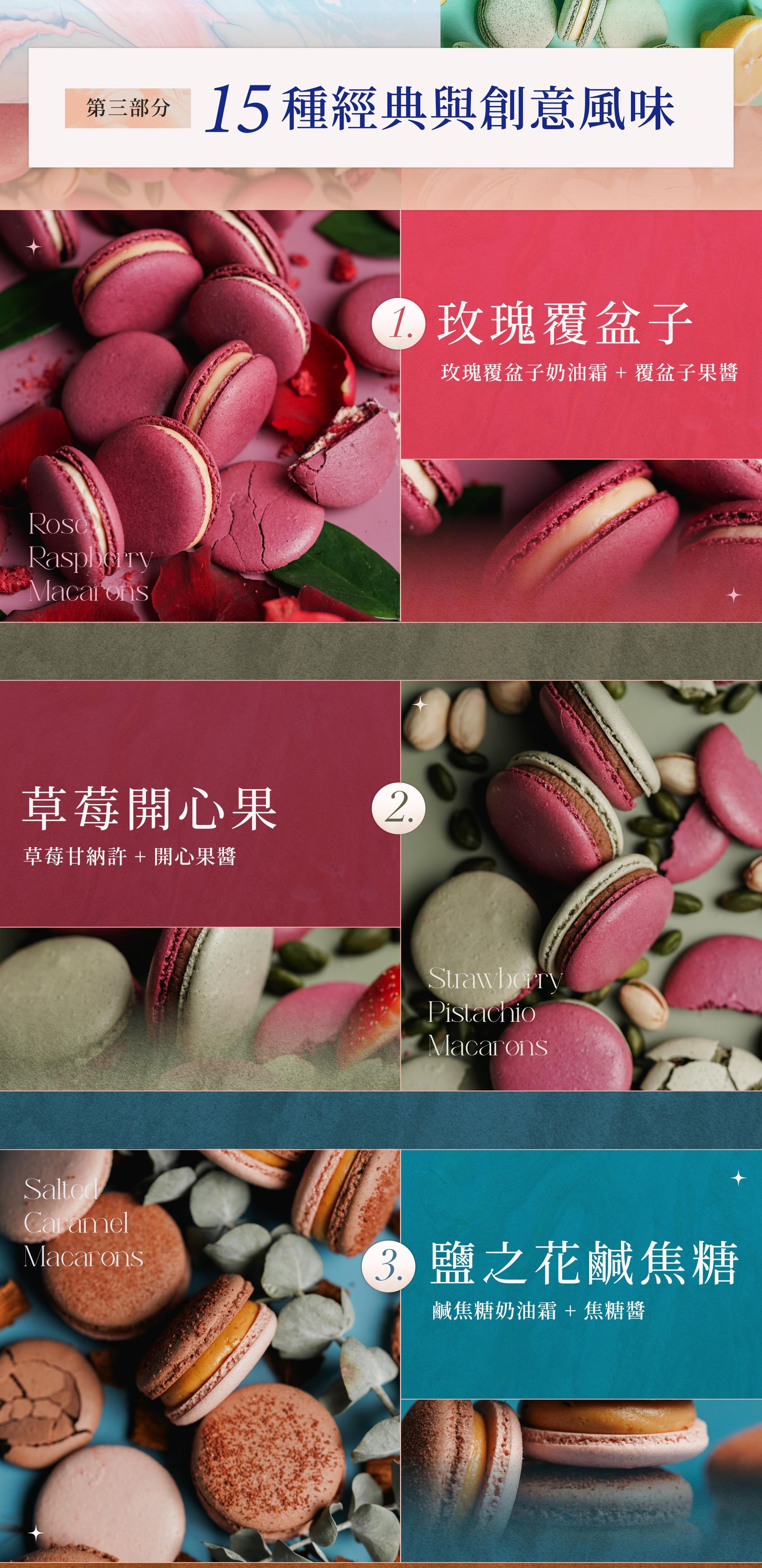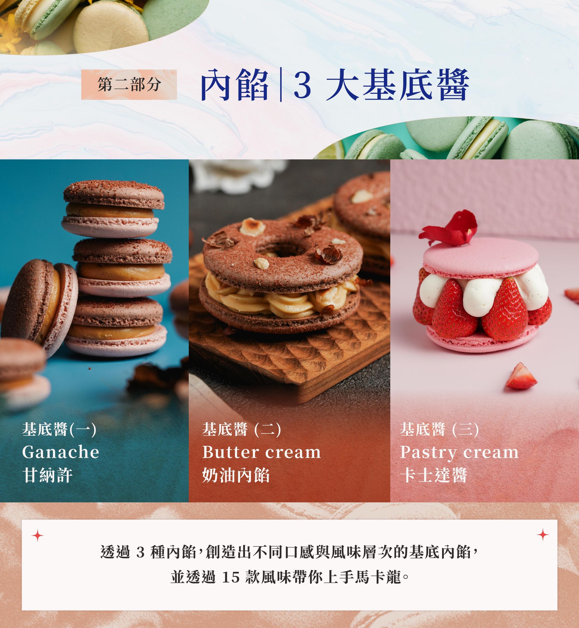 ❶ 15 款職人級營業用配方大公開:Eva 嘗試多次的完美配方,不藏私一次教給你!3 種蛋白霜 X 15 款風味內餡製作 X 5 種果醬製作 X 外殼技巧 = ♾️️百變無限的風味呈現