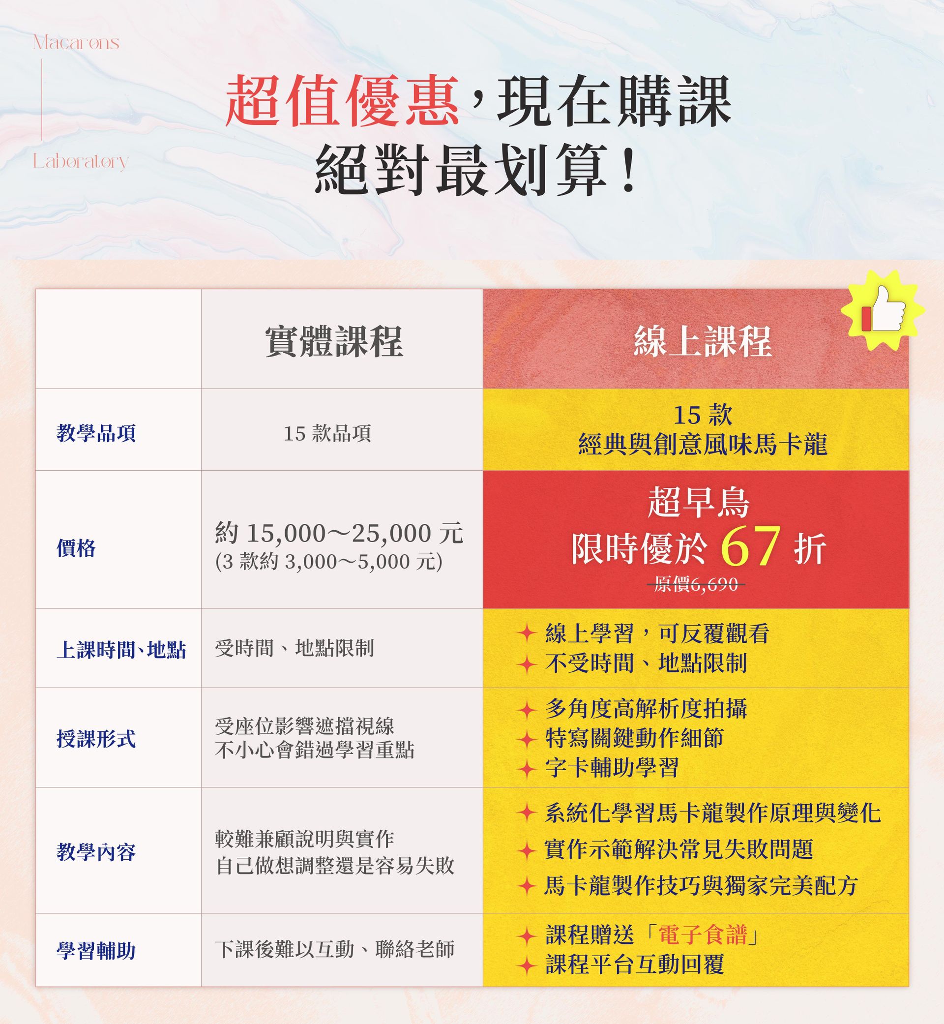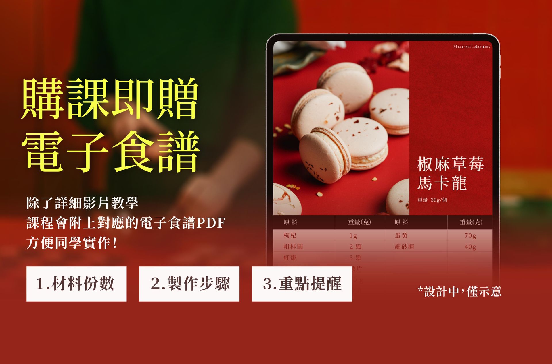 ❸ 零失敗X保證美味|課程隨附精美電子食譜:購課即贈精美電子食譜,詳述完整的原料、比例、教學步驟,你也能在家做出口感柔軟酥脆、零失敗、保證美味的馬卡龍。
