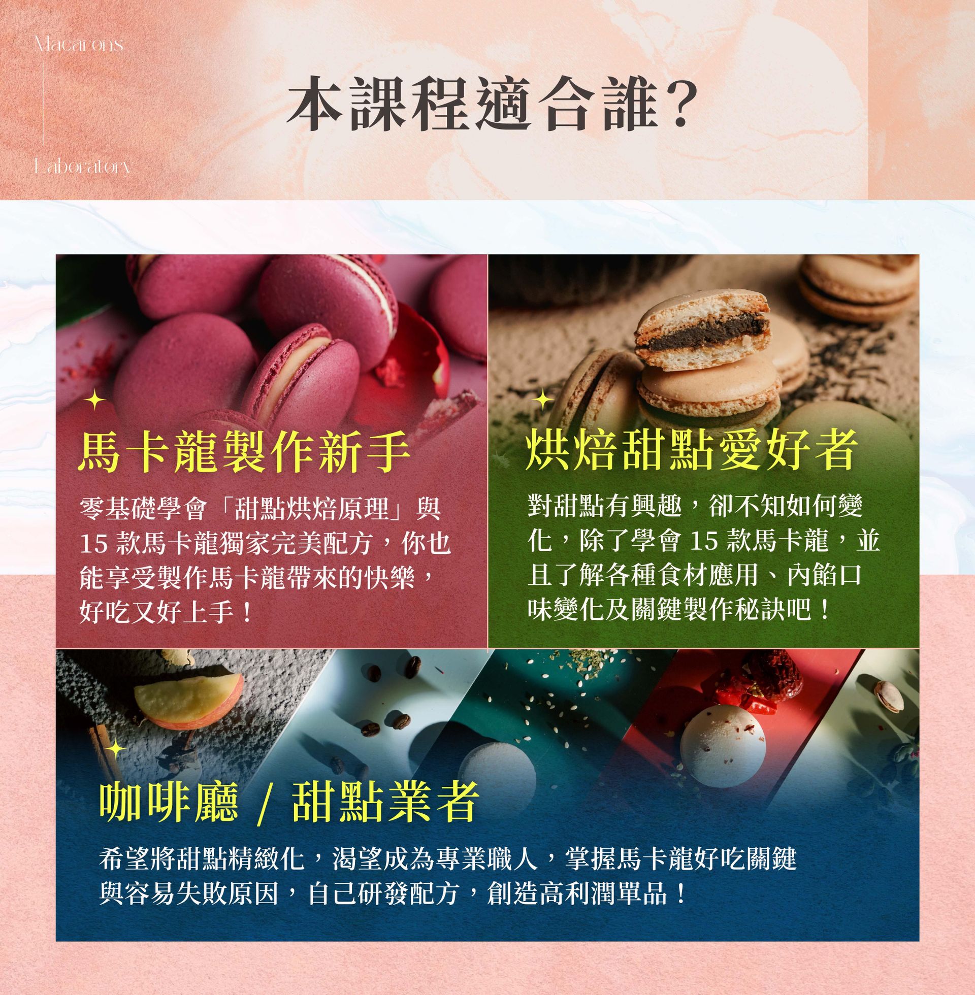 ❷ 系統化學習馬卡龍製作原理與風味變化:家用、商用都適合的烘焙原理解析、配方調整秘訣。課程由豐富多變的內餡搭配變化而成,實作示範教學,帶你解決馬卡龍常見失敗問題與保存方法。