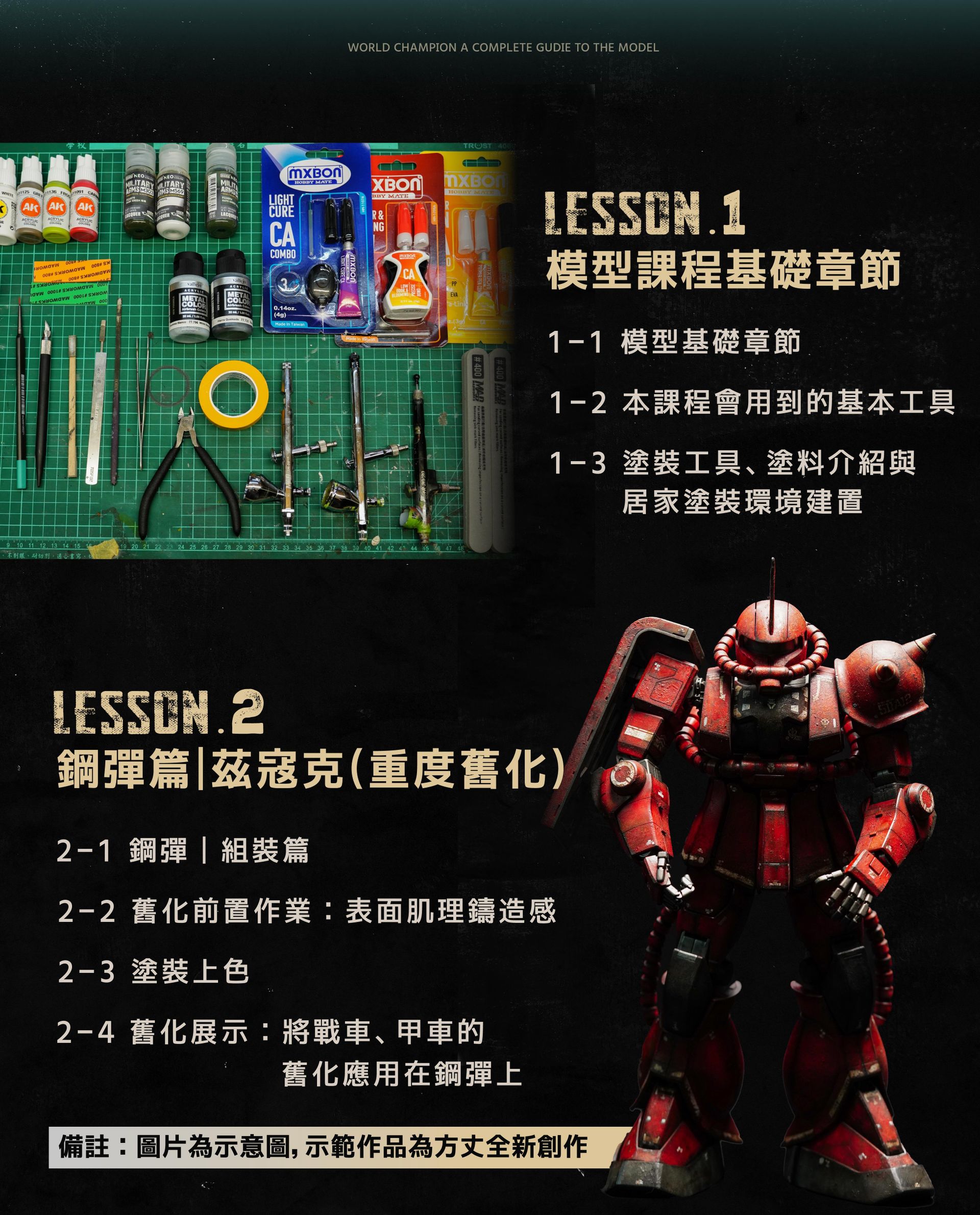 這堂「世界冠軍模型全攻略|塗裝與舊化技法」線上課,由 樊成彬(方丈) 世界模型大賽總冠軍 教學,課程設計成「初學者」到「有經驗者」都可學習,我會將幾十年來所有的技術、觀念與撇步,分布在課程的「實作示範作品」中,帶你學會應用在鋼彈、甲車、飛機、場景等所有的舊化應用技法,讓你透過詳細影片,可以更容易學習我的這些手法。還有大家敲碗很久的「方丈帶你逛美術社」介紹實用的美術用品。 課程 10% 教學模型的組裝與打磨,90% 著重在各種塗裝與舊化的技法應用。
