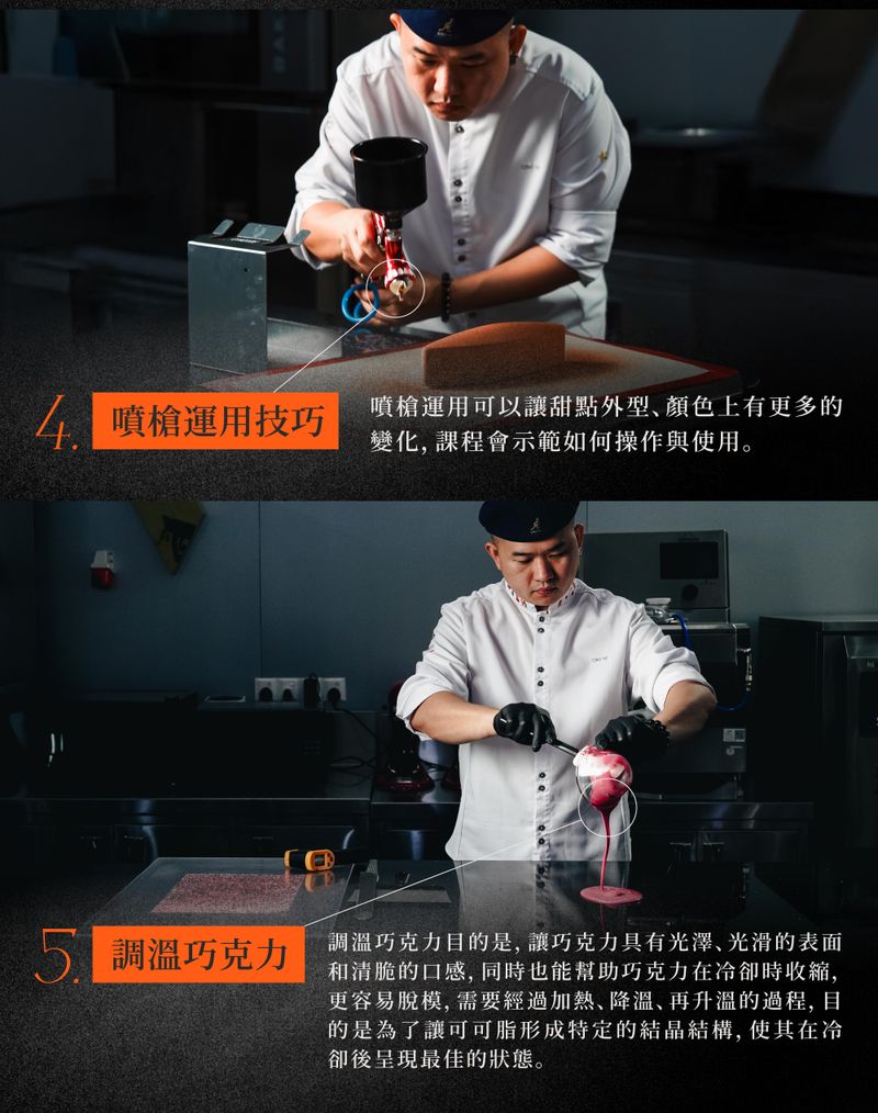 ❷風味萃取 × 美感設計,雙重提升|從果泥慕斯搭配、真空浸泡到天然抗氧化技巧,結合吉利丁轉印、3D 模具等造型技術,讓甜點「好吃又好看」。