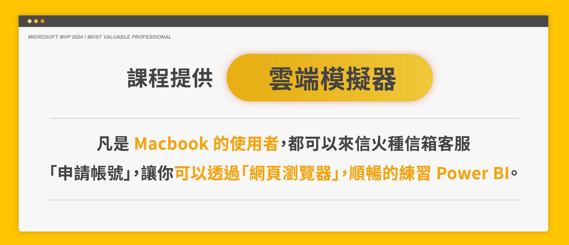 📍本課程提供「Power BI 雲端模擬器」,Mac 系統使用者可來信申請,在家輕鬆練習!(PC 使用者勿來信申請)