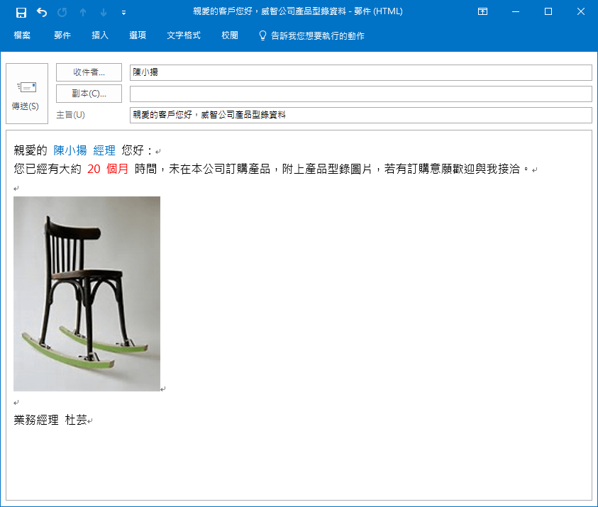 每一個客戶的信件是客製化、獨立寄出。信件的內容與Word內容相同,型錄照片也完整地呈現在電子郵件裡。