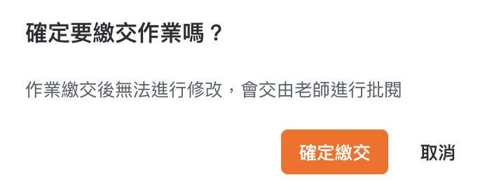 6.完成作業內容並完成指定附件上傳(或無指定),可點選右上角「繳交作業」,繳交後就無法再進行編輯及修改,若確定則可在提示視窗按下「確定繳交」。
